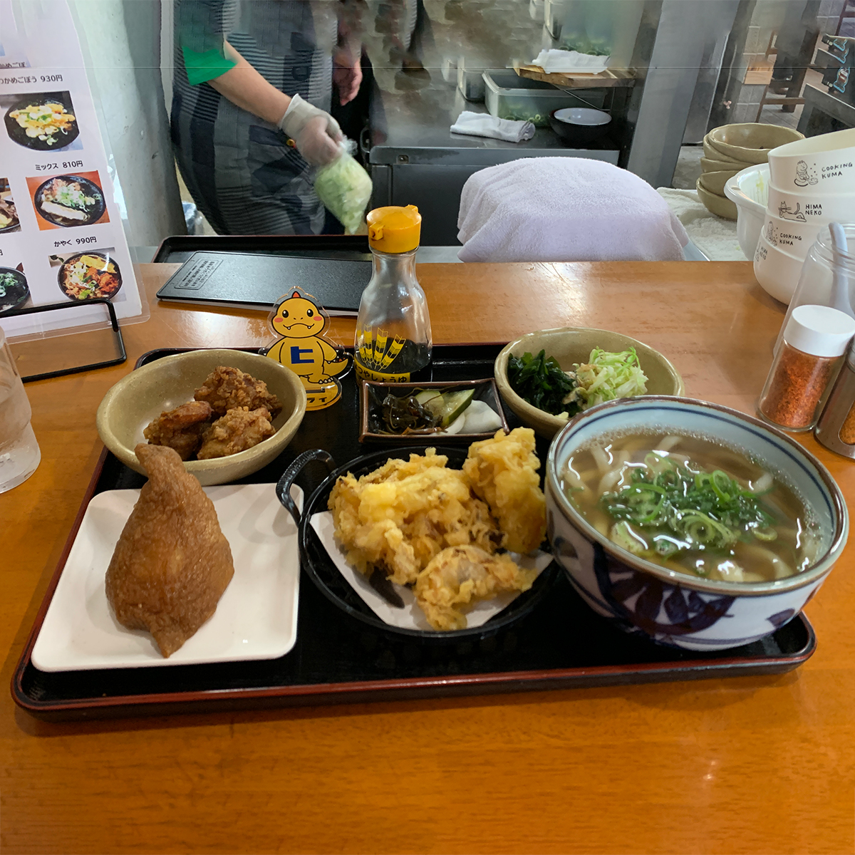 「うどん定食のかきあげで、いなり。一緒にお醤油ください」