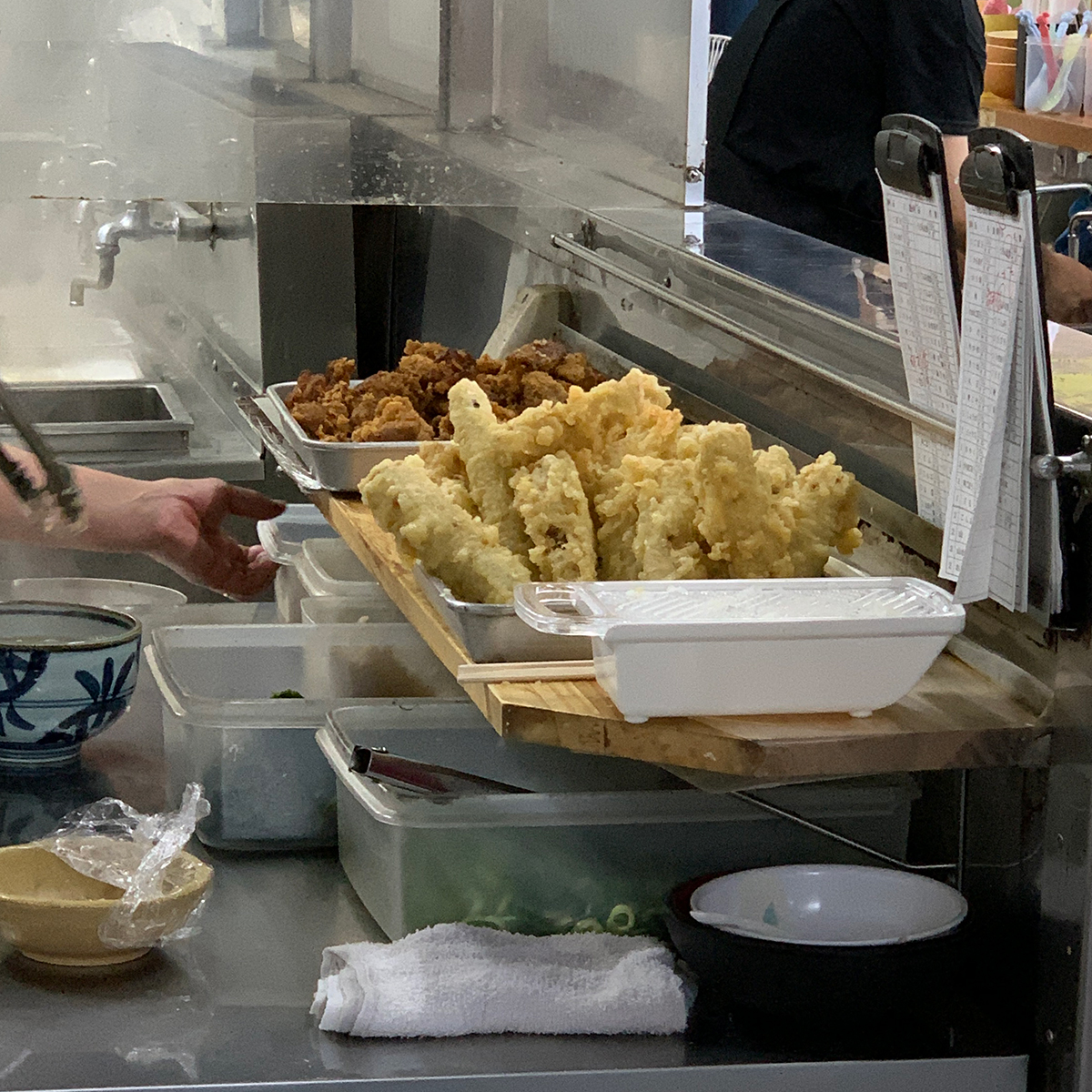 からあげとごぼう天は作り置き。かきあげは揚げたてなのでボクはいつもかき揚げを注文するんだよ。