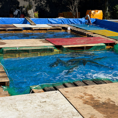 ↓水槽で泳ぐ大きな魚たち。じつはこのあとこの魚のつかみ取り大会やるんだって。怖いわ~。
