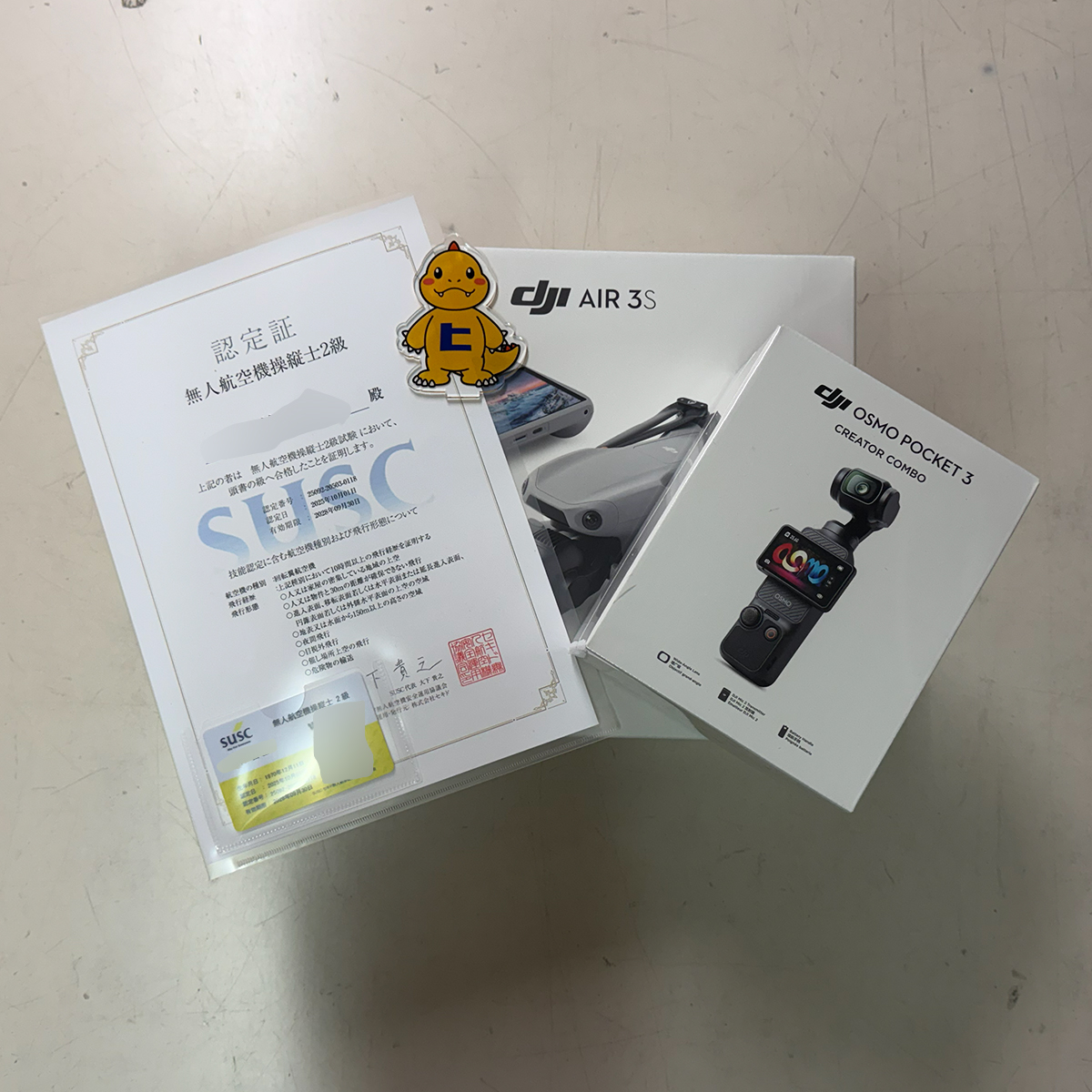 先日、ドローンの資格取得の講習を受けてきたけど、その証明書と実際のドローンが到着したよ。AIR 3Sが到着。もう一つはモバイル動画カメラのOSMO POCKET3。