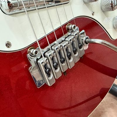 トレモロのウィルキンソン。初めてみたのはジェームスタイラーのバーニングウォーターだね。近未来的なブリッジとスパーゼルペグの組み合わせは衝撃的だったよ。その憧れからブリッジはこれ。